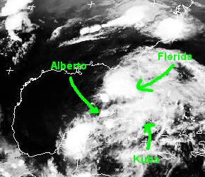Der erste Tropensturm dieses Jahres auf dem Atlantik präsentiert sich auf diesem Bild vom Montagmorgen sehr untypisch zerrissen. Das Zentrum über dem Golf von Mexiko ist kaum zu erkennen, auch die typische Form fehlt fast ganz. Immerhin bringt Tropensturm 'Alberto' Windböen von bis zu 90 km/h zustande, das entspricht 10 Beaufort.