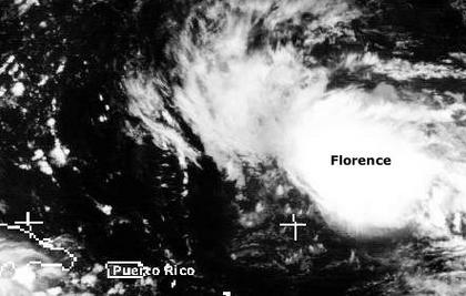 Der Tropische Sturm 'Florence' liegt derzeit nordöstlich von Puerto Rico im Atlantik. Er erreicht mittlere Windgeschwindigkeiten von etwa 85 km/h. Im weiteren Verlauf könnte der Sturm zum Hurrican heraufgestuft werden, da er sich noch verstärken soll. Allerdings wird er nach jetzigem Stand nach Norden abdrehen und auf dem Atlantik weiterziehen.