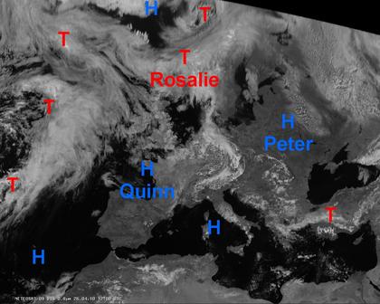 Das heutige Satellitenfoto von Europa zeigt, dass der überwiegende Teil des Kontinents von Hochdruckeinfluss, und somit von freundlichem und trockenem Wetter, charakterisiert ist. Ein Tiefausläufer reicht von Dänemark über Deutschland bis in die Alpen und bringt hier einzelne Schauer bei häufig starker Bewölkung. Auch von Griechenland bis zur westlichen Türkei kann ein Tiefdrucksystem einzelne Schauer oder Gewitter bringen. Deutlich dichtere Wolken und häufige Niederschläge sind von Skandinavien bis nach Nordwestrussland zu erwarten.