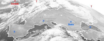 Auf dem Satellitenfoto ist von der Iberischen Halbinsel, über die Pyrinäen, nach Frankreich, über weite Teile Mitteleuropas bis in den Südosten des Kontinents zum Schwarzen Meer Hochdruckeinfluss auszumachen, der in diesen Regionen für einen meist freundlichen und trockenen Tag mit meist nur geringer Bewölkung sorgt.