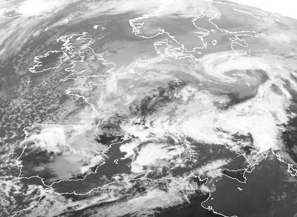 Das Tief 'Steffi' hat sich aufgeteilt. Das Zentrum des östlichen Teils ist noch gut an der Wolkenspirale über Polen zu erkennen. Über Deutschland und Frankreich gibt die Bewölkung des sich auflösenden Tiefs einen eher ungeordneten Eindruck. Hier fällt örtlich noch ein wenig Regen oder Schnee. Im Westen erkennt man Schauerbewölkung über dem Atlantik, die bis nach Nordafrika reicht. Am Mittelmeer ist die Bewölkung von den Gewittern geprägt, die hier entstanden sind. Über der Nordsee findet man keine höhere Bewölkung mehr. Hier gewinnt das Hoch 'Gerd' an Einfluss. Über der Nord- und Ostsee ist aber schwach die dort liegende Hochnebeldecke zu erkennen.