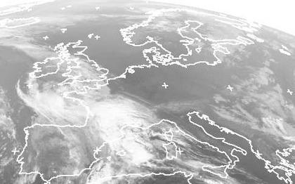 Auf dem heutigen Satelittenfoto zeigen sich über Westeuropa, vom westlichen Mittelmeer, über die Iberische Halbinsel, Frankreich bis zu den Britischen Inseln teils sehr viele Wolken, die zum Teil kräftige Schauer und Gewitter bringen können. Von Nord- und Ostfrankreich bis zum Uralgebirge sowie von Skandinavien bis zum zentralen Mittelmeer ist es bei wenigen Wolken bzw. oft wolkenlosem Himmel meist trocken. Etwas Regen fällt an der nördlichen Adria sowie am Schwarzen Meer.