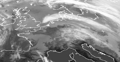 Über West- und Mitteleuropa liegen nur wenige höhere Wolken. Am auffälligsten ist ein Wolkenband, das sich von der Nordsee bis nach Polen erstreckt. Es bringt aber keinen Niederschlag. Über weiten Teilen Norddeutschlands, der Niederlande, Frankreichs und Großbritannien erkennt man aber Nebel oder Hochnebel.