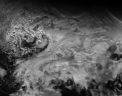 Auf dem Satellitenbild ist über West- und Mitteleuropa dichte Bewölkung einer Zyklonenfamilie erkennbar, die sich vom Baltikum über Polen und den Balearen bis zum Atlantik erstreckt. Über Großbritannien ist die zelluläre Bewölkung im Bereich des Tiefs 'Vincent' zu sehen.