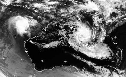 Das Satellitenbild zeigt den Wirbelsturm 'Harvey' an der Küste vom Carpentaria-Golf in Nordaustralien, gestern ist er mit Windgeschwindigkeiten von 90, in Böen bis zu 120 km/h auf das Land getroffen und schwächt sich dabei schnell ab. Nordwestlich von Australien erkennt man das Tief 'Vivienne'; seine Windgeschwindigkeit beträgt zur Zeit 60, in Böen 80 km/h. Es ist noch unklar ob es sich zu einem Taifun entwickelt oder nicht.