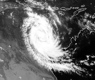 Die Wolkenspirale auf dem Satellitenbild von Freitag früh gehört zu dem Wirbelsturm 'Willy', der zur Zeit parallel zur Nordwestküste Australiens entlang zieht. Er erreicht Windgeschwindigkeiten von 175, in Böen 213km/h und verstärkt sich noch. Morgen soll er voraussichtlich in Böen 232km/h erreichen.