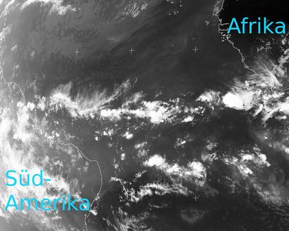 Nordöstlicher Passate auf der Nordhalbkugel und südostliche Passate auf der Südhalbkugel verursachen ein Zusammenströmen von Luft am Äquator. In dem Konvergenzbereich, auch Innertropische Konvergenzzone (ITCZ) genannt, kommt es zum Aufsteigen der Luft, also zur Konvektion und Wolken- und Schauerbildung. In dem Satellitenbild sieht man diese Schauerwolken in einem Band, das sich etwas nördlich des Äquators befindet. Somit kann man die Lage der ITCZ, die im Jahresverlauf mit der Sonneneinstrahlung ein wenig nach Nord oder Süd wandert, gut erkennen. (Bildquelle: NERC Satellite Receiving Station, Dundee University, Scotland, http://www.sat.dundee.ac.uk/)