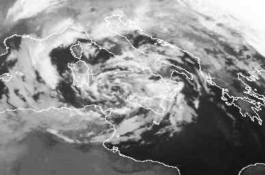 Der Wolkenwirbel über dem Mittelmeer gehört zu dem Sturmtief 'Quirin' mit seinem Kern zwischen Korsika und Sizilien. Im gesamten westlichen und südlichen Mittelmeer herrscht stürmischer Wind vor. Dazu kommen zum Teil kräftige Schauer, vor allem in Süditalien.