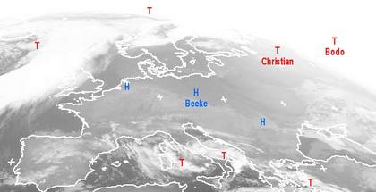 Auf dem Satellitenfoto von heute Morgen zeigt sich ein breiter Streifen von England und Frankreich, über Deutschland, Tschechien, Ungarn bis zum Schwarzen Meer vielfach wolkenlos oder nur gering bewölkt. Ebenso meist freundlich und trocken ist es unter Hochdruckeinfluss im Süden Skandinaviens. Nach Nordskandinavien bis rüber nach Schottland und Irland gelangen mehrere Tiefausläufer mit etwas mildere Atlantikluft und Regen oder einzelnen Schauern. Im Mittelmeerraum ist es ebenso vielfach stark bewölkt und es entwickeln sich zahlreiche Schauer, teils auch Gewitter.