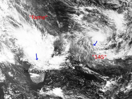 Gleich zwei Tropenstürme haben sich bei Madagaskar gebildet. Während der eine mit Codenamen '14S' recht weit draußen vor der Küste liegt und mittlere Geschwindigkeiten von 95 km/h sowie in Böen von 130 km/h aufweist, hat 'Fame' die Kategorie Eins nach Saffir-Simpson erreicht und wird daher als Zyklon eingestuft. Seine Windgeschwindigkeiten liegen bei 150 km/h im Mittel und bei 185 km/h in Böen. Er wandert voraussichtlich langsam südöstlich weiter und damit genau über Madagaskar, wo es zu viel Regen und Wind kommt. (Bildquelle: NERC Satellite Receiving Station, Dundee University, Scotland, http://www.sat.dundee.ac.uk/)