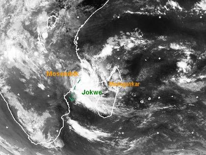Zyklon 'Jokwe' hat heute mit Windgeschwindigkeiten von 185, in Böen bis zu 230 km/h die Küste von Mosambik erreicht, er bringt hier Sturm und Starkregen, Berechnungen zufolge zieht er in den nächsten Tagen langsam nach Süden, wobei er sich langsam wieder abschwächt. (Bildquelle: NERC Satellite Receiving Station, Dundee University, Scotland, http://www.sat.dundee.ac.uk/)