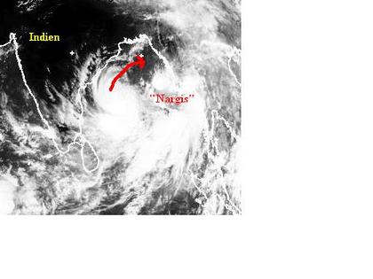 Im Golf von Bengalen ist auf dem Satellitenbild von Dienstag früh der Zyklon 'Nargis' gut zu erkennen. Zur Zeit erreicht er mittlere Windgeschwindigkeiten von 157, in Böen 195 km/h. Berechnungen zufolge soll sich der Zyklon Richtung Nordosten ziehen, sich aber nicht weiter verstärken. Sein Endziel ist noch unklar. (Bildquelle: NERC Satellite Receiving Station, Dundee University, Scotland, http://www.sat.dundee.ac.uk/)
