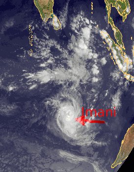 Mitten über dem Indischen Ozean liegt derzeit der Zyklon 'Imani'. In Spitzenböen erreicht er Windgeschwindigkeiten bis zu 140 km/h. Er zieht jedoch nach Süden und schwächt sich etwas ab. Bewohnte Gebiete sind nicht gefährdet.