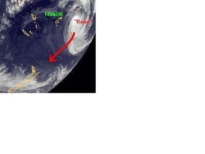 Über den Polynesischen Inseln im Südpazifik hat sich der Zyklon 'Rene' aufgewirbelt. Zur Zeit liegt er über den Samoa-Inseln mit mittleren Windstärken von 185, in Böen 232 km/h. Berechnungen zufolge soll er sich jedoch etwas abschwächen und südwestwärts, über Tonga hinweg, Richtung Neuseeland ziehen. Sein Endziel ist allerdings noch unklar.