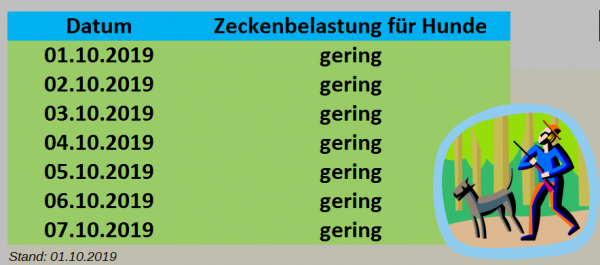Beim Spaziergang im Wald sind die Hundezeckenrisiken in dieser Woche durchweg sehr gering.
