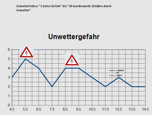 In der kommenden Woche gelangen in einer meist westlichen bis südlichen Strömung zeitweise feuchtwarme Luftmassen in die Bundesrepublik. Insbesonders am Dienstag, jedoch auch in den Folgetagen muss mit teils kräftigen Schauern und Gewittern gerechnet werden. Die Schwerpunkte des Gewitterpotentials bilden am Dienstag dabei vor allem der Süden und Osten Deutschland. In Schauer- und Gewitternähe weht dazu ein zum Teil starker Wind.