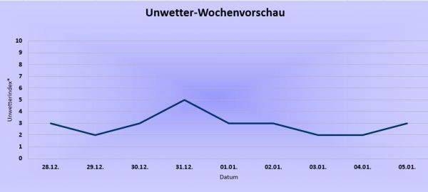Die Gefahren durch Unwetter bleiben in der Woche um den Jahreswechsel zum Großteil gering. Im Norden zeigt sich dagegen über weite Strecken windiges bzw. auch stürmisches Wetter, dabei herrscht besonders an den Küsten und auf den Bergen zeitweise auch Sturm. Am Donnerstag ist es voraussichtlich im gesamten Land windig und es sind regional stürmische Böen möglich.
