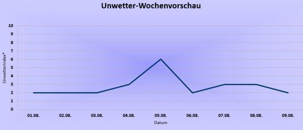 Die Risiken durch mögliche Unwetter bleiben in der laufenden Wetterwoche zunächst landesweit nur gering. Erst nach Wochenmitte zeigen die Modelle ein ansteigendes Gewitterpotenzial im Süden und Südosten Deutschlands, dabei können sich hier voraussichtlich am Freitag regional starke Gewitter entwickeln. Ab Samstag bleiben die Unwetterrisiken wiederum verbreitet gering.