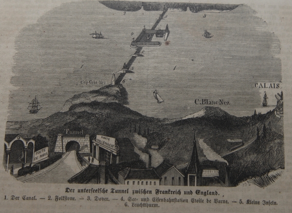 Seit dem Jahr 1994 kann man wetterunabhängig, durch den Bahntunnel von Frankreich aus, nach England reisen. Bei der Schiffsreise war man sehr auf das Wetter angewiesen. Nicht wenige fürchteten den stürmischen Kanal bei der Überfahrt und einige ließen auch ihr Leben. Die Idee für den Tunnel ist schon sehr alt, wie die Zeichnung aus dem Jahr 1857 zeigt. Schon damals träumte man von einer europäischen Querung des Kanals, die dann von der englischen Premierministerin Thatcher und dem französichen Präsidenten Mitterand Anfang der achtziger Jahre des. 20. Jahrhunderts beschlossen wurde. England konnte damit, wie zu Zeiten der letzten Eiszeit, wieder trockenen Fußes erreicht werden.