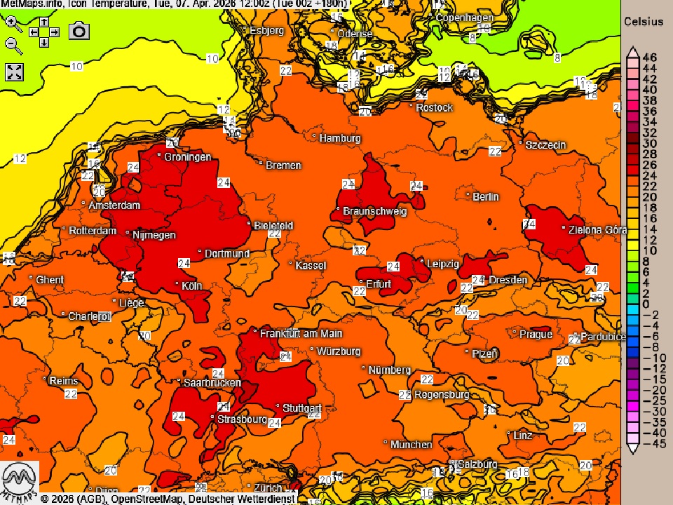 Die Wetter- und Temperaturkarte für Dienstag (07.04., 12:00 Uhr) nach ICON: