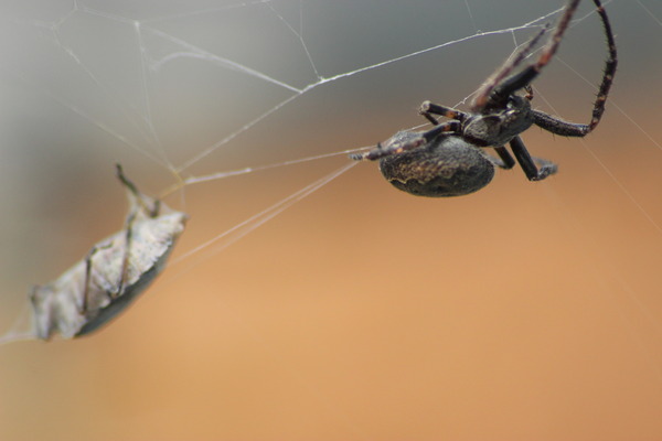 Diese weibliche Spaltenkreuzspinne hat in ihrem Netz eine Wanze gefangen und in ihre Fäden eingewickelt. Diese Spinnenart findet sich in fast jedem deutschen Garten. Bei diesem schönen und trockenen Wetter verfangen sich auch reichlich Opfer in ihrem großem Netz.
