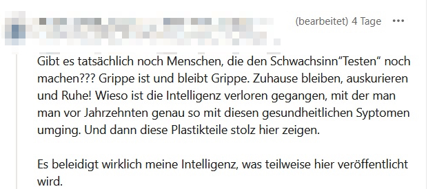 Soweit eigentlich nichts Ungewöhnliches – sollte man zumindest meinen. Denn das unverfängliche Posting einer (positiven) Influenza-Testkassette brachte auf LinkedIn zwar auch den ein oder anderen positiven und bestärkenden Kommentar (an dieser Stelle nochmals vielen Dank für die Genesungswünsche), bei vielen anderen aber wohl eher das Blut zum Kochen. Um es deutlich zu sagen: Bei der Mehrheit der Kommentatorinnen und Kommentatoren blieb einem am Ende nicht viel mehr übrig, als erhebliche Zweifel an der Intelligenz der Menschheit zu hegen – so bezeichnete etwa einer der Kommentatoren die Grippe (ca. 20.000 Todesfälle in Deutschland pro Jahr) als „erfundenes Virus“. Ein Großteil der "Gesundheitsexperten" zweifelte zudem an der Genauigkeit von Selbsttests; dabei fiel es ihnen gleichzeitig aber schwer, zwischen einer Grippe und einem grippalen Infekt zu unterscheiden.