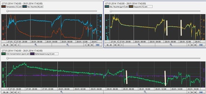 Wenn IP-basierte Sensoren in unsere Wohnungen und Gebäude einziehen und große Datenspezialisten die Daten auswerten, spätestens dann wird es eine 'Privatsphäre' nicht mehr geben. Für ein bisschen Bequemlichkeit geben wir hochsensible Daten preis. Mit Hilfe von Temperatur-, Feuchte- und Co2-Daten in der Wohnung kann in Sekunden analysiert werden, wer, wann und wo zu Hause ist. In der Abbildung ist ein Temperatur-, Feuchte- und Co2-Profil zu sehen. Zwischen den beiden weißen Balken ist anhand der Co2-Werte und der absoluten Feuchtigkeit zu erkennen, dass keiner zu Hause ist. Mit Hilfe einfacher Analysetools ist erkennbar, wieviele Personen etwas in der Wohnung machen, ob Fenster geöffnet werden, oder Türen geöffnet wurden. Die Optimierung der Heizung/Lüftung bringt sicherlich einige Vorteile für den Benutzer, vielleicht auch kleine Kosteneinsparungen, für die Datensammler sind es aber wahre Schätze, die für fast keinen Gegenwert preis gegeben werden. Liegen viele Daten vor, was Menschen gerade machen, können Energie-, Wasser-, Gasverbrauch kurzfristig sehr genau vorhergesagt werden. Suchmaschinen finden andere Resultate, wenn sie meinen der Kunde 'langweilt' sich, oder ist z.B. gerade beim kochen und bekommt dann dafür Vorschläge und Werbung. Ziel ist es, vorher zu wissen, was der Mensch tun möchte.