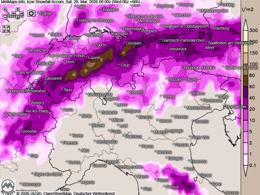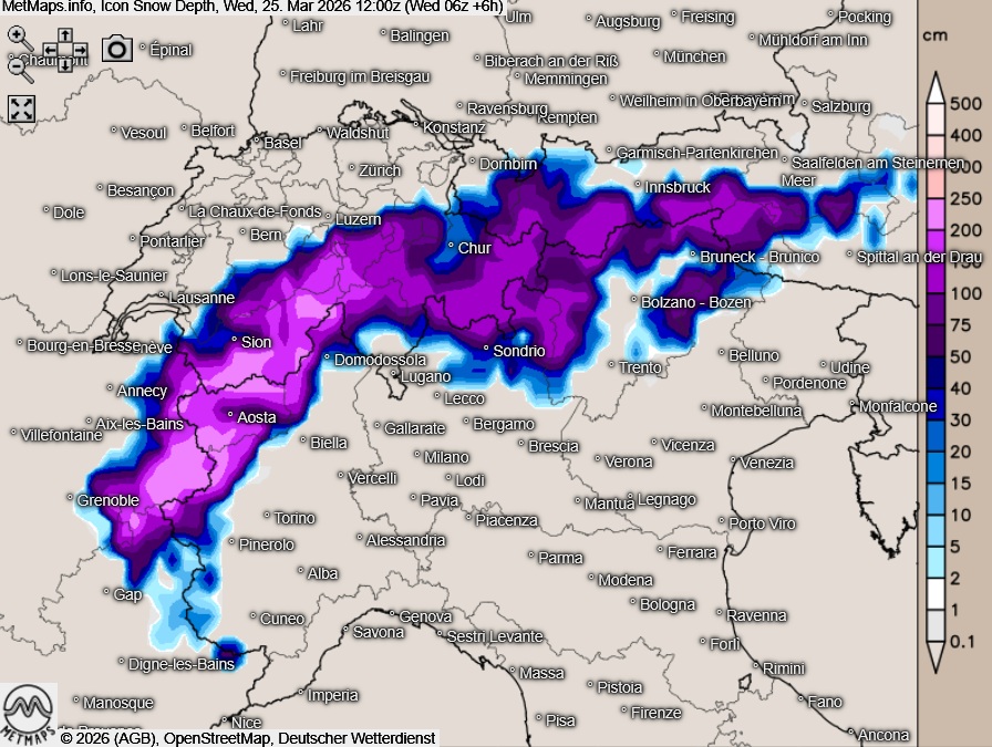 Die aktuellen Schnehöhen (25.03., 12:00 Uhr) sowie akkumulierten Neuschneemengen bis Samstag (00:00 Uhr) nach ICON: