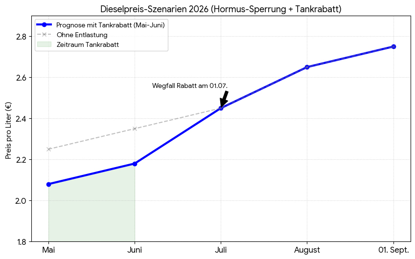 Wie die Grafik verdeutlicht, könnte der Wegfall des Rabatts am 1. Juli den Dieselpreis unmittelbar in Richtung der 2,50-Euro-Marke katapultieren, sollte sich die Lage bis dahin nicht entscheidend geändert haben. Im Spätsommer/Frühherbst sind selbst Literpreise von 2,75 Euro nicht auszuschließen.