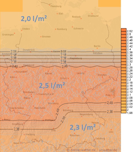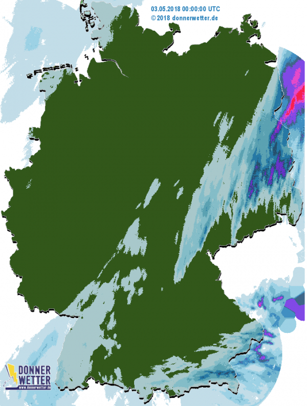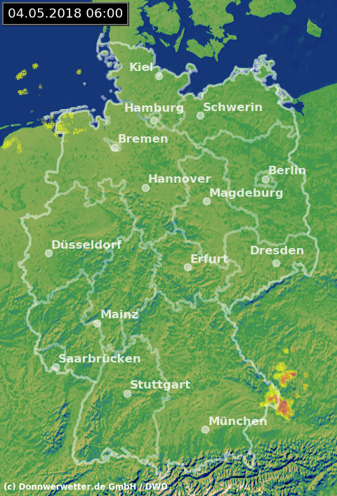 Das Niederschlagsradarbild zeigt momentan nur selten Aktivitäten. In den kommenden Stunden fallen einzelne schwache Niederschläge meist nur im Nordseeumfeld sowie auf der Schwäbischen Alb. Ein kräftigeres Regengebiet liegt zur Zeit über dem Bayerischen Wald mit nordwestlicher Zugbahn. Hier sind regional auch vereinzelte Gewitteraktivitäten zu erwarten.