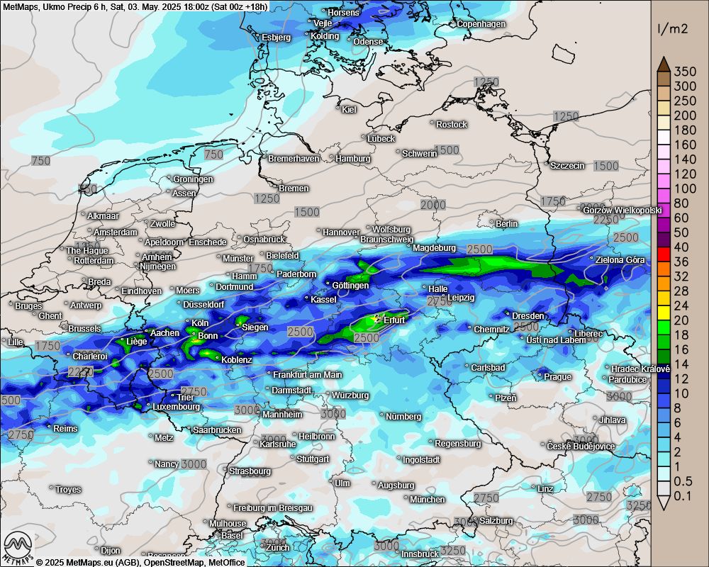Die folgende Karte zeigt die prognostizierten Sechs-Stunden-Gesamtniederschlagsmengen bis Samstag, 18 Uhr. Wir empfehlen Euch in den betroffenen Regionen auf die aktuellen Unwetterwarnungen zu achten.