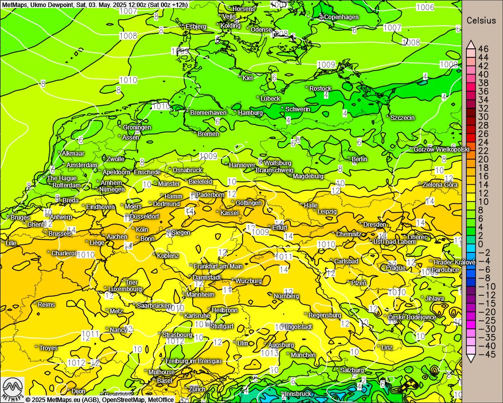 Die Karte zeigt die aktuellen Taupunkttemperaturen über Mitteleuropa - dort, wo der Taupunkt über 13/14 Grad liegt (Mitte und Süden) besteht am Samstag ein erhöhtes Starkregenrisiko. Erste Gewitter sind schon aktiv.
