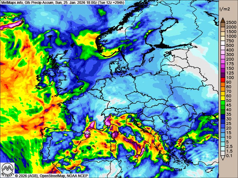 Die akkumulierten Niederschlagsmengen für Europa bis zum 25.01.2026 (18:00 Uhr) nach GFS: