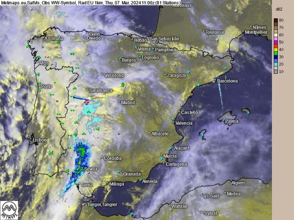 Starkregen zieht zur Zeit über Sevilla und später auch über Malaga hinweg. Zudem gibt es wie erwartet Dauerregen im Norden Spaniens und Portugals.