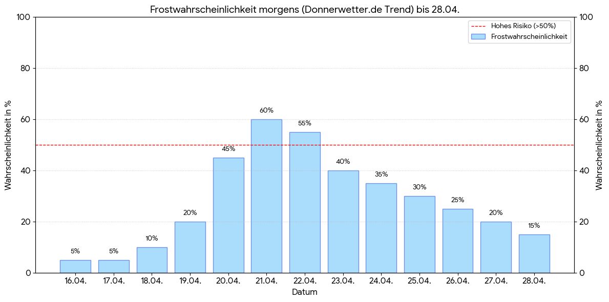 Auch bis in den Beginn des Monats Mai hinein bleibt das Risiko für Spätfrost bestehen. Die kommenden Tage zeigen einen deutlichen Temperaturrückgang mit einem Kaltlufteinbruch zum Wochenstart. Entsprechend steigt regional auch die Wahrscheinlichkeit für Nachtfrost wieder an.