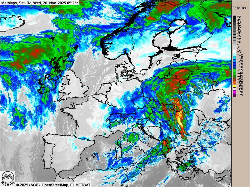 Das Satellitenbild (IRC) für Europa (26.11.) sowie die Wetterkarten für Mittwochnachmittag und Donnerstagfrüh nach ICON: