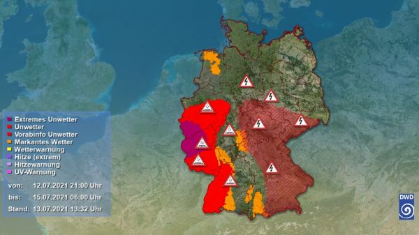 Kopie der Wettermeldung vom 13.7.2021 - Warnung vor Tief Bernd auf Donnerwetter.de