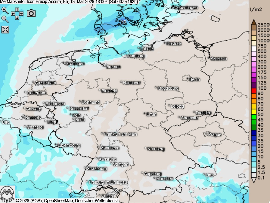 Die akkumulierten Niederschlagsmengen bis Freitag, 13.03. (18:00 Uhr) nach ICON: