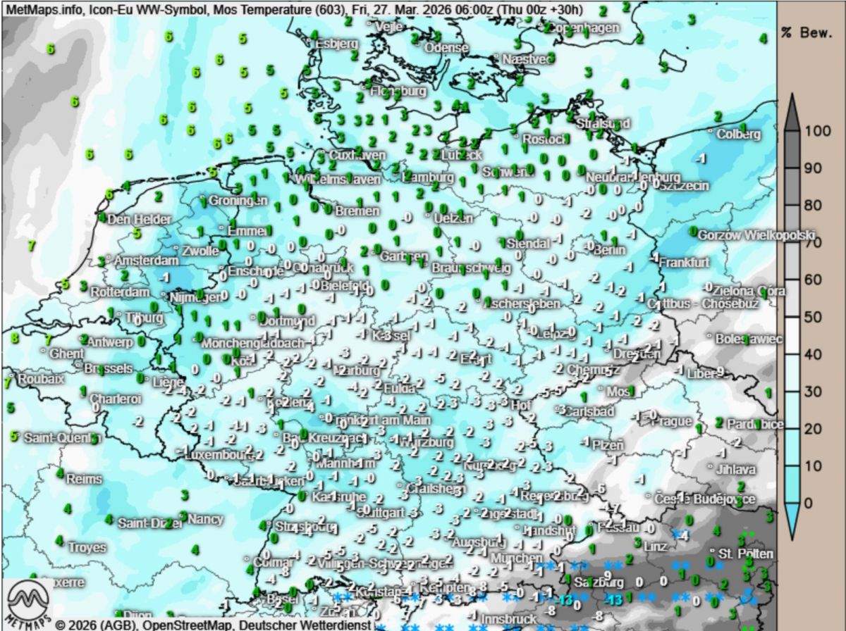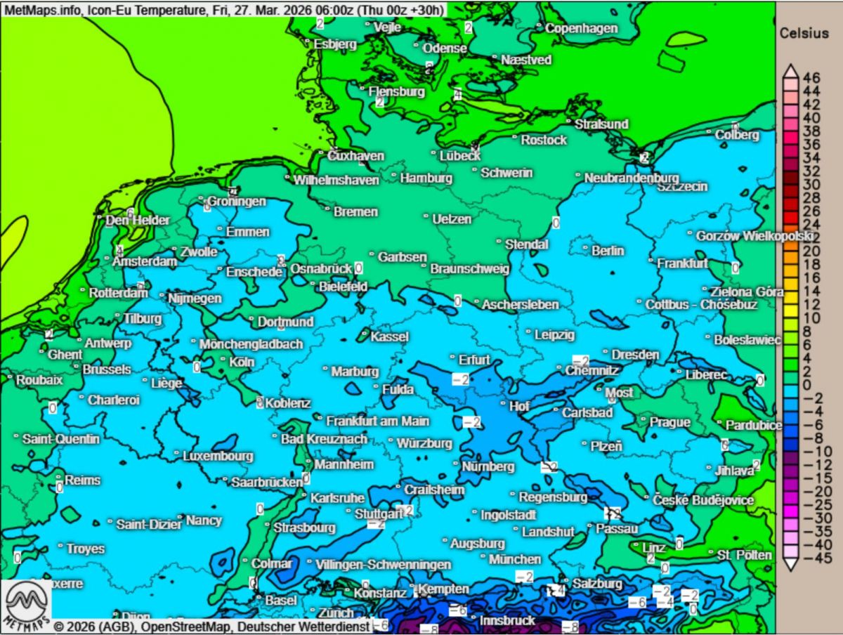 Die Temperaturkarte für Freitagfrüh (06:00 Uhr) sowie die Wetter- / Temperaturkarten für Freitag- und Samstagmorgen (06:00 Uhr) nach ICON: