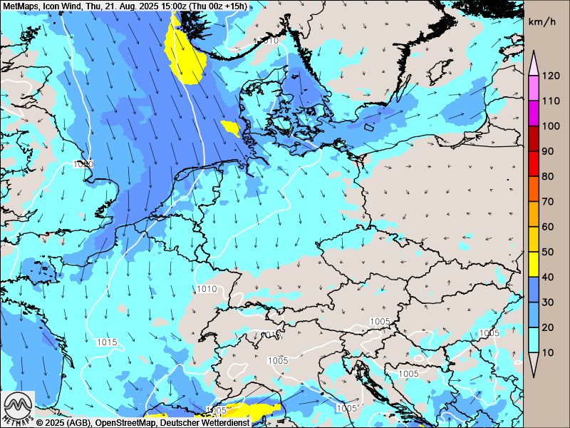 Strömungs- / Windkarte Donnerstag, 15:00 Uhr nach ICON