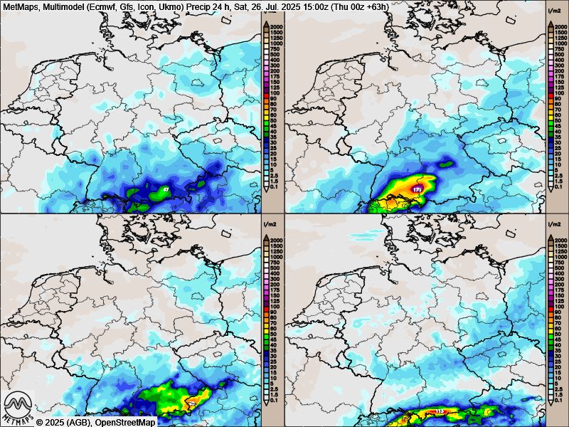 Aufgrund der geríngen Zuggeschwindigkeit kann das Tief erhebliche Regenmengen produzieren, zudem ist es von Gewittern durchsetzt. Je nach Modelllauf sind innerhalb von 24 Stunden Regenmengen über 100 l/m² möglich.