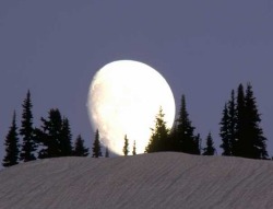 Manchmal sieht der Mond wie auf dem Foto gigantisch groß aus, kurz darauf schon wieder winzig klein. Meistens fallen wir dabei einer optischen Täuschung zum Opfer. Ohne Vergleichspunkte sieht unser Gehirn den Mond mitten am Himmel als relativ klein an. Mit Vergleichspunkten wie zum Beispiel Bäumen und Häusern am Horizont kann er dagegen riesig groß wirken.