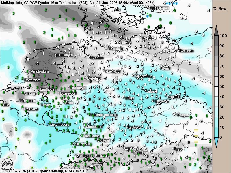 Die Wetter- / Temperaturkarten für Samstagnachmittag sowie Sonntag- und Dienstagmittag nach GFS: