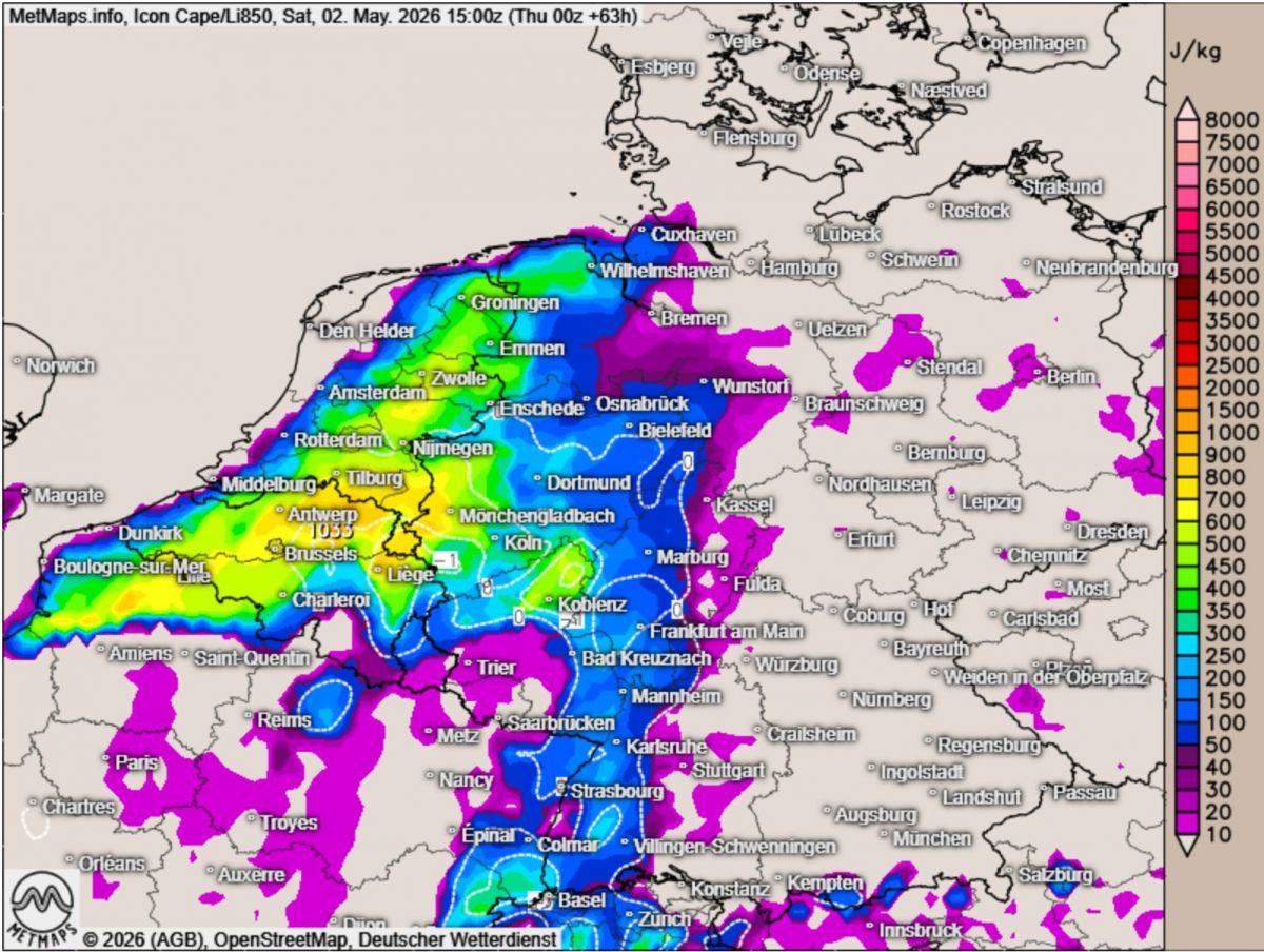Die Instabilitätskarte / Cape-Lifted sowie die Wetterkarte für Samstagnachmittag (15:00 Uhr) nach ICON: