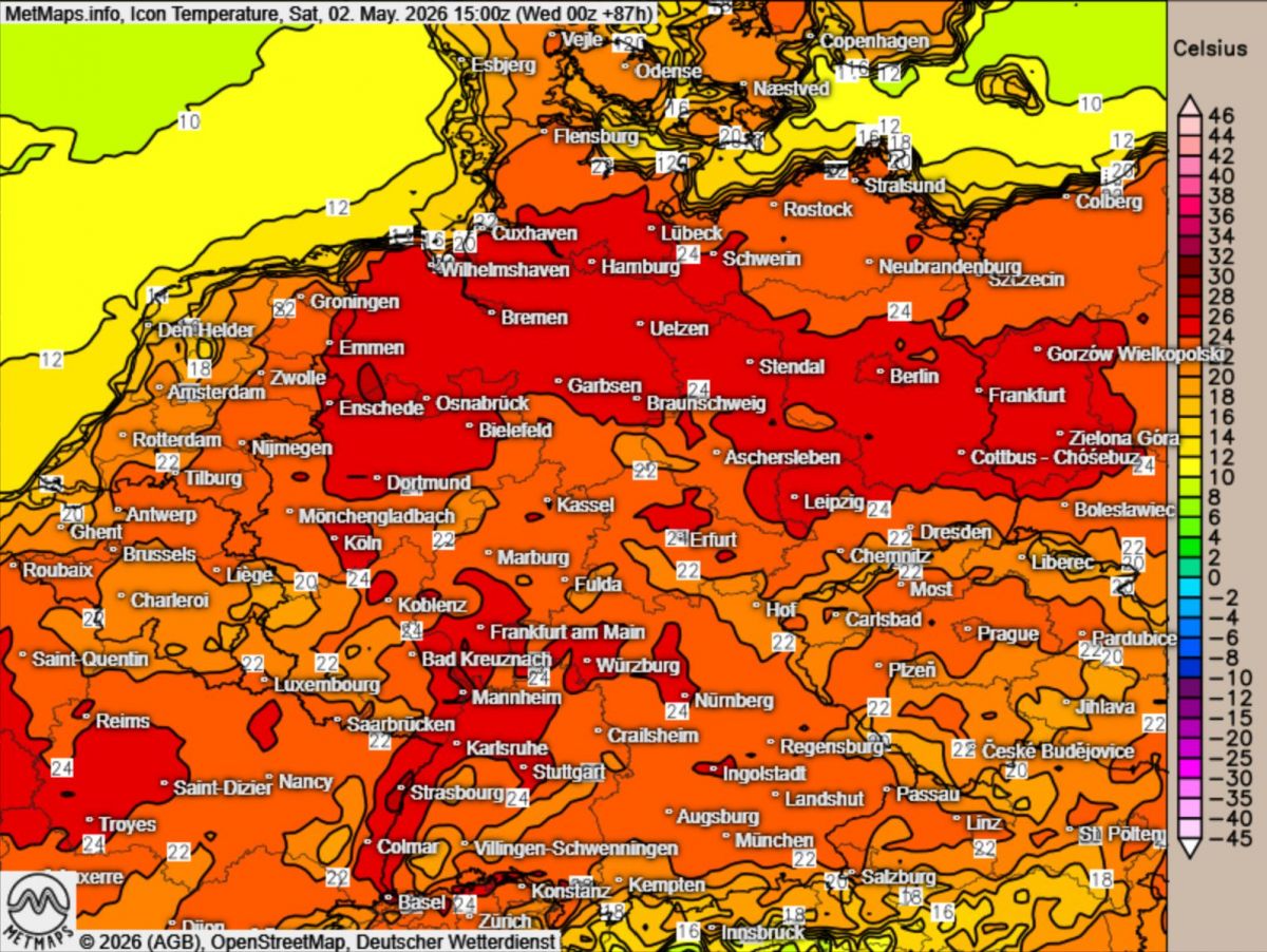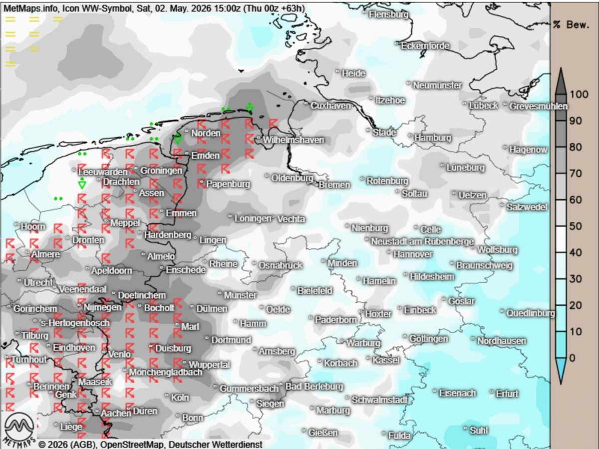Besonders betroffen sind nach aktuellen Daten Teile von NRW, Niedersachsen und Schleswig-Holstein. Hier entwickeln sich ab dem Nachmittag aus der Quellbewölkung lokale Schauer und Gewitter.