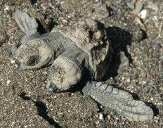 Eine für Meeresschildkröten äußerst seltene Fehlbildung beobachtete ein WWF-Mitarbeiter an der Pazifikküste Costa Ricas. Carlos Drews fotografierte nach Hinweisen von Einheimischen eine frisch geschlüpfte Pazifische Bastardschildkröte (Lepidochelys olivacea) mit zwei Köpfen. „Eine zweiköpfige Meeresschildkröte wurde hier seit mindestens 50 Jahren nicht mehr gesichtet“, berichtete der WWF-Schildkrötenexperte aus der Küstenstadt Ostonia westlich der Hauptstadt San José. Hier liegt einer von drei bekannten Stränden, an denen die bedrohten Meeresreptilien ihre Eier vergraben.