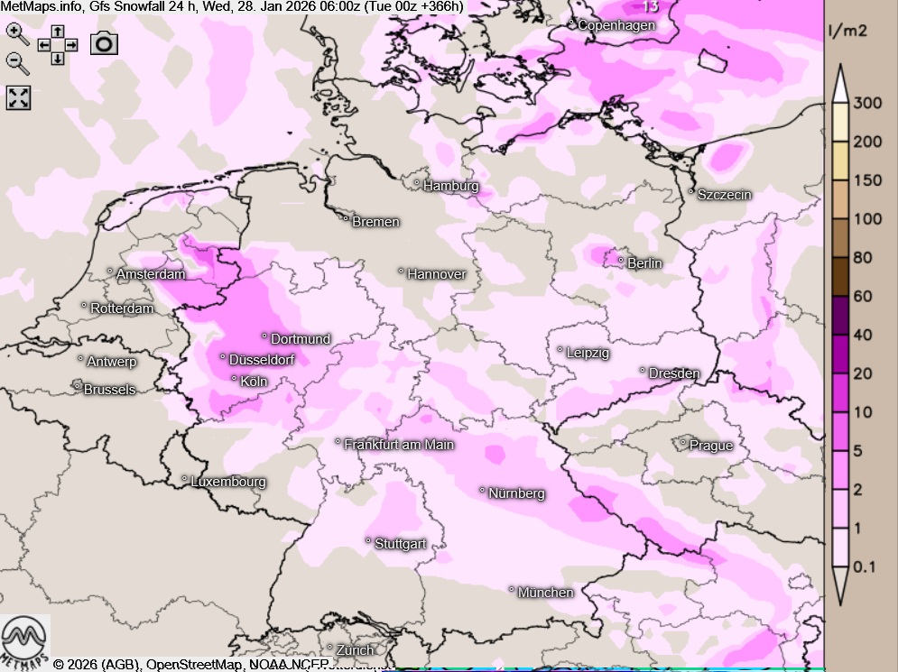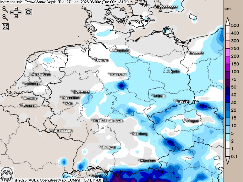 Die Sechs-Stunden-Temperaturminima und die Schneehöhen für den 27.01. (06:00 Uhr) nach ECMWF sowie die 24-Stunden-Schneemengen bis 28.01. (06:00 Uhr) nach GFS: