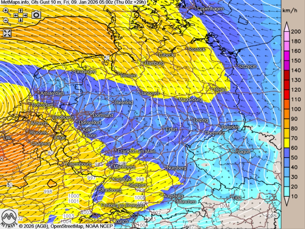 Die Sechs-Stunden-Niederschlagsmengen / Niederschlagtyp bis Freitagfrüh (05:00 Uhr), die Böenkarte für Freitagfrüh (05:00 Uhr) sowie die Wetterkarte für 03:00 Uhr nach GFS: