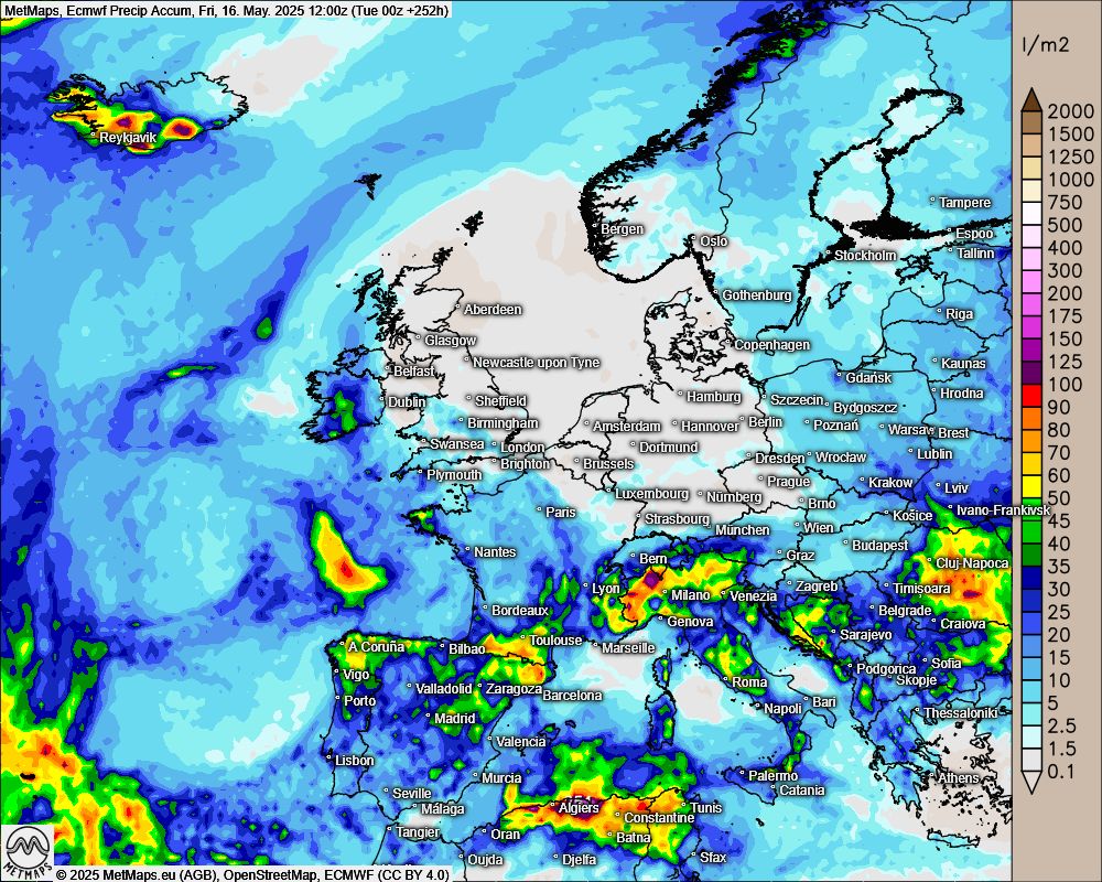 Die Vorhersagekarte zeigt die durch das europäische Wettervorhersagemodell berechneten Gesamtniederschlagsmengen bis zum 16.5.