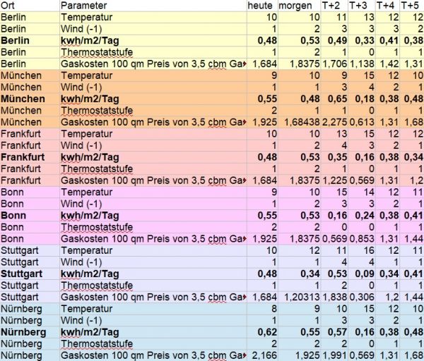 Anhand der mittleren Tagestemperatur und der Windstärke wird zum einen der Energieaufwand in kWh pro Tag und Quadratmeter ausgewiesen; zum anderen die täglichen Kosten, die bei der Beheizung einer 100 Quadratmeter großen Wohnfläche bei einem durchschnittlichen Gaspreis von 0,35 Euro/kWh anfallen.